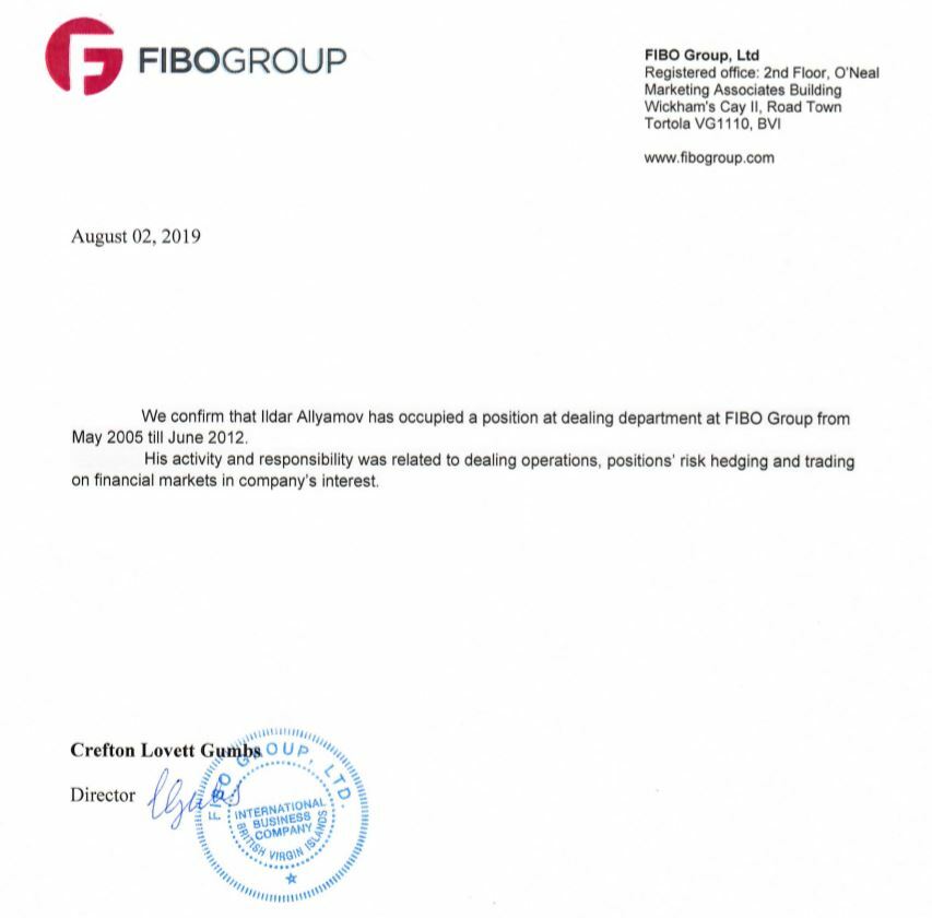 Подтверждение опыта работы в брокерской компании FIBO Group
