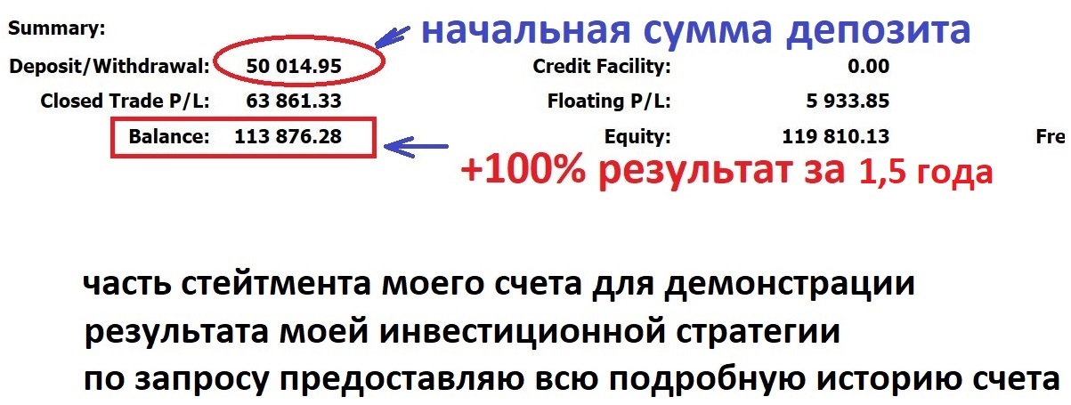 Стейтмент моего торгового счета в компании Forexclub (версия для демонстрации результата применения моей инвестиционной стратегии) с августа 2021 года по ноябрь 2023 года, длительность 1,5 года, начальный депозит 50 000 уе, прибыль 65 000 уе. полная версия и короткая с результатом.